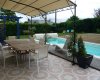 Le jardin clos de 800m2 dispose d'une terrasse en bois de 60 m2 et d'une piscine chauffée enterrée de 8*4 sécurisée par un volet roulant automatique, petite pateaugoire pour les petits. La maison, située dans un petit bourg calme (à Ergué-Gabéric), est à 2 pas de la forêt et de tous commerces, à pied.
